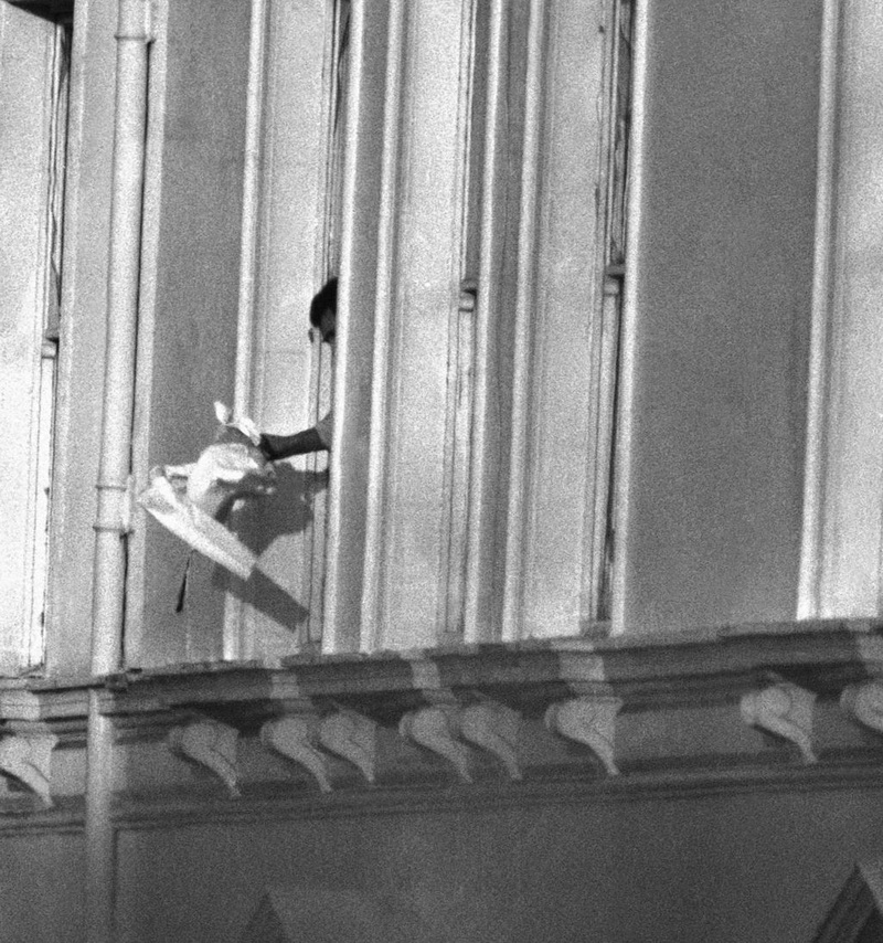 直播中镜头捕抓到一名武装分子向外挥舞白色衣服表示投降