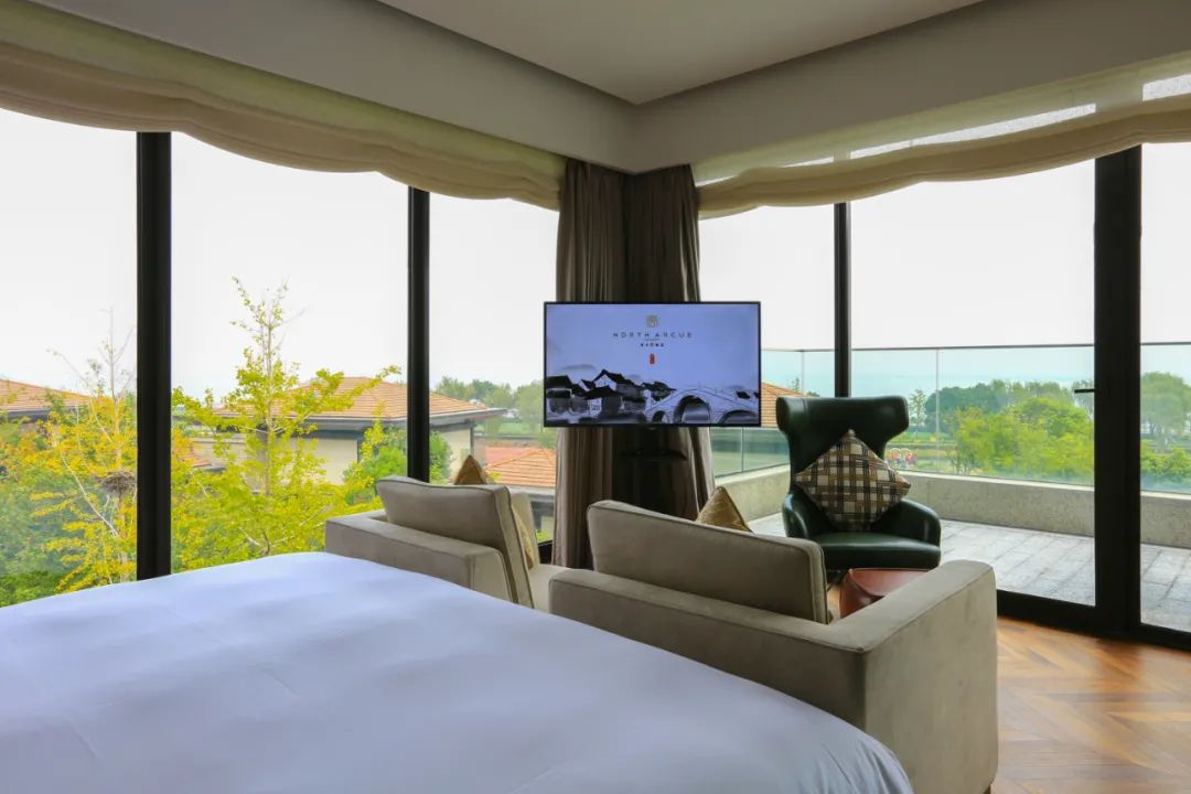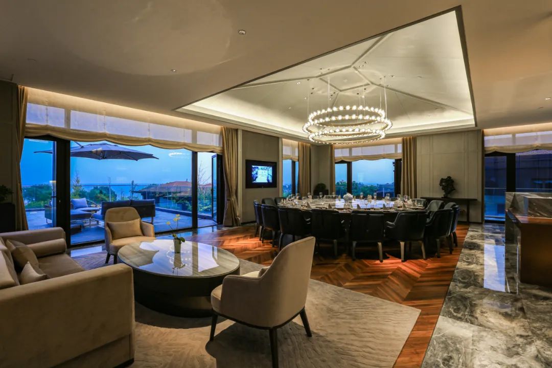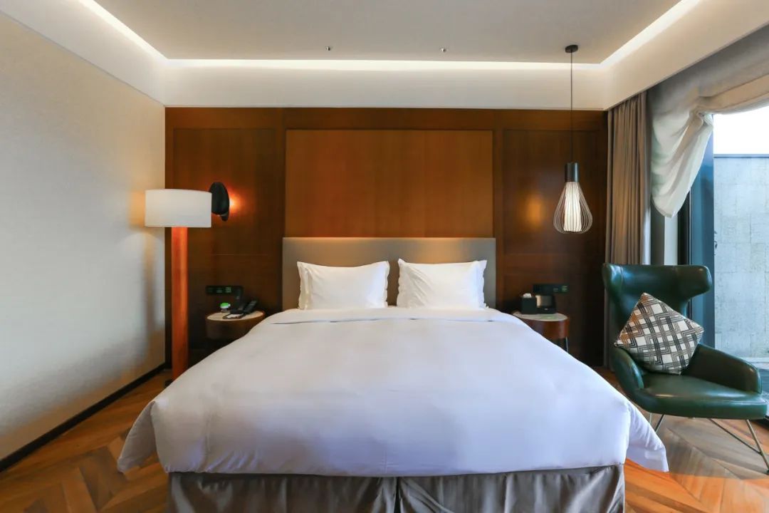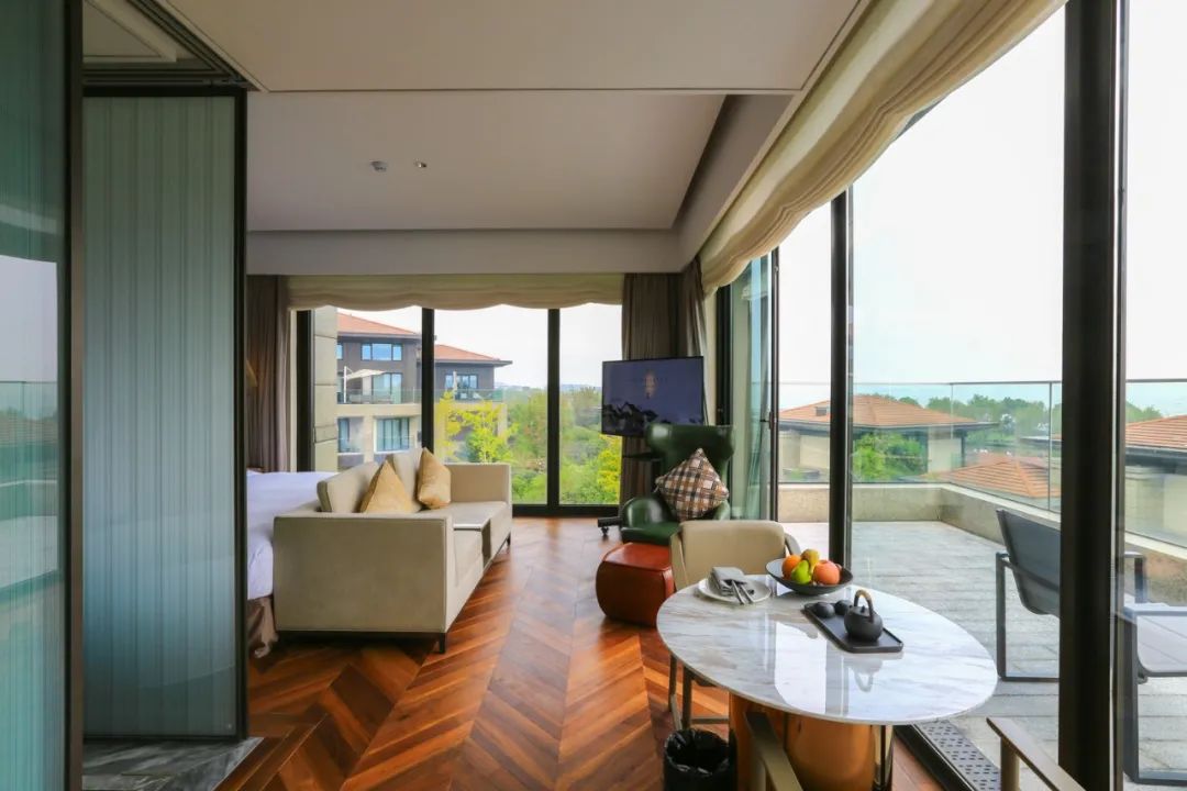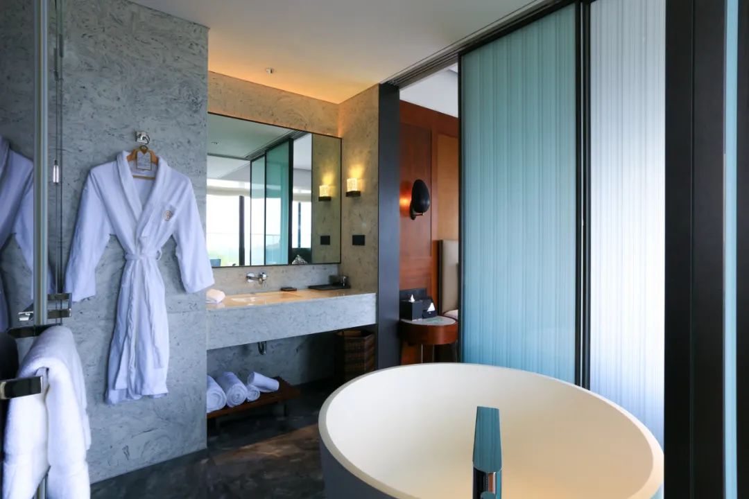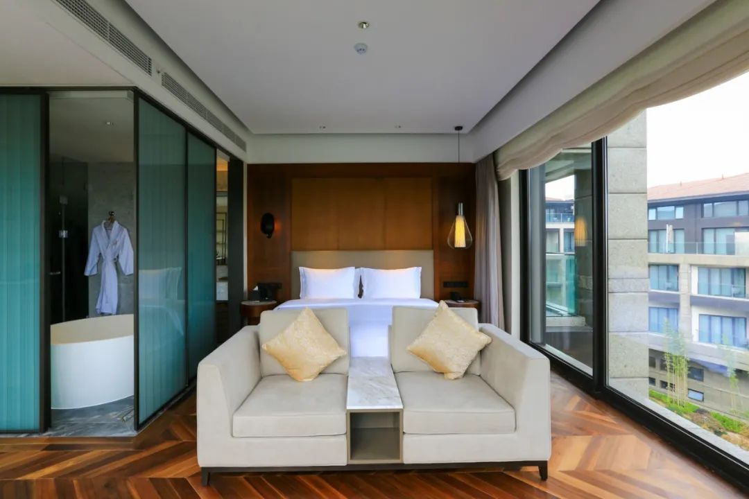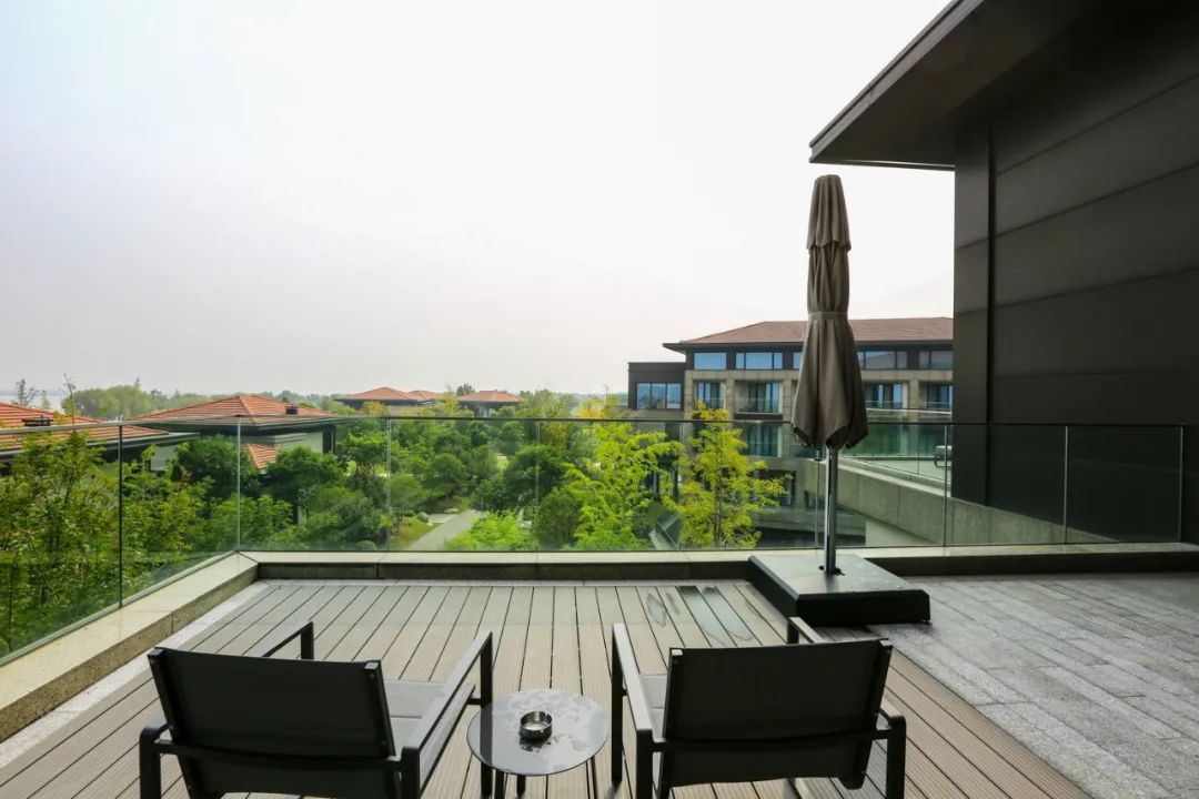 而同样位于客房指廊另一顶端的湖景套房,则展现出宽敞无比的气度,严格区分的客厅与卧室,超大的卫浴空间,直面湖景的宽敞露台。非常适合高端商旅体验。