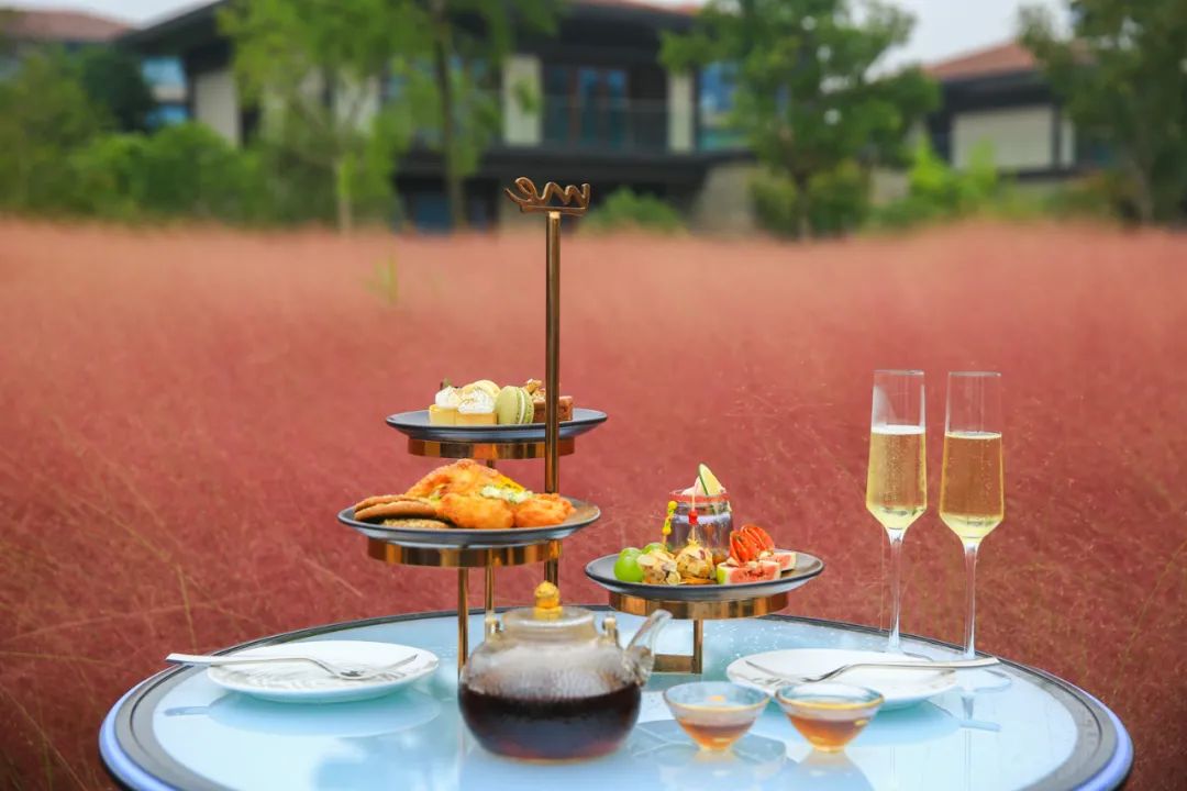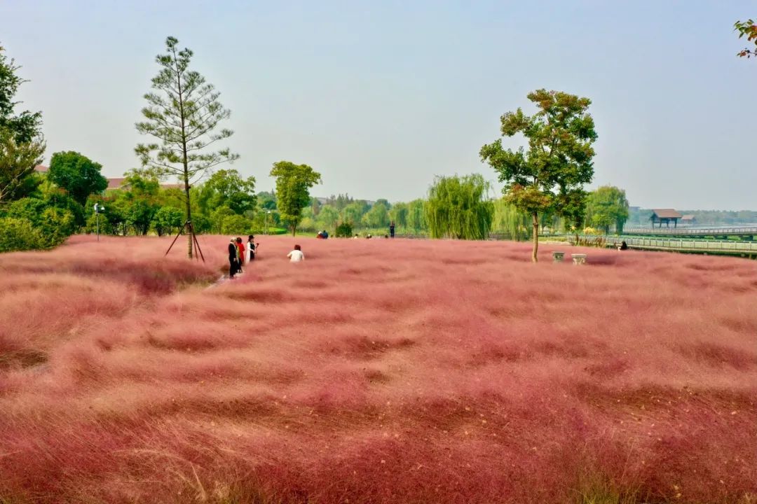在两片粉黛乱子草田中间的湖畔亲水草坪,也是非常出片,不仅颜值高,也是一片多功能的草坪,可以举办户外婚礼,也可以野餐、团建游戏等等。不过,最惬意的莫过于来一份户外下午茶,满目粉色与绿色,分分钟刷遍朋友圈。