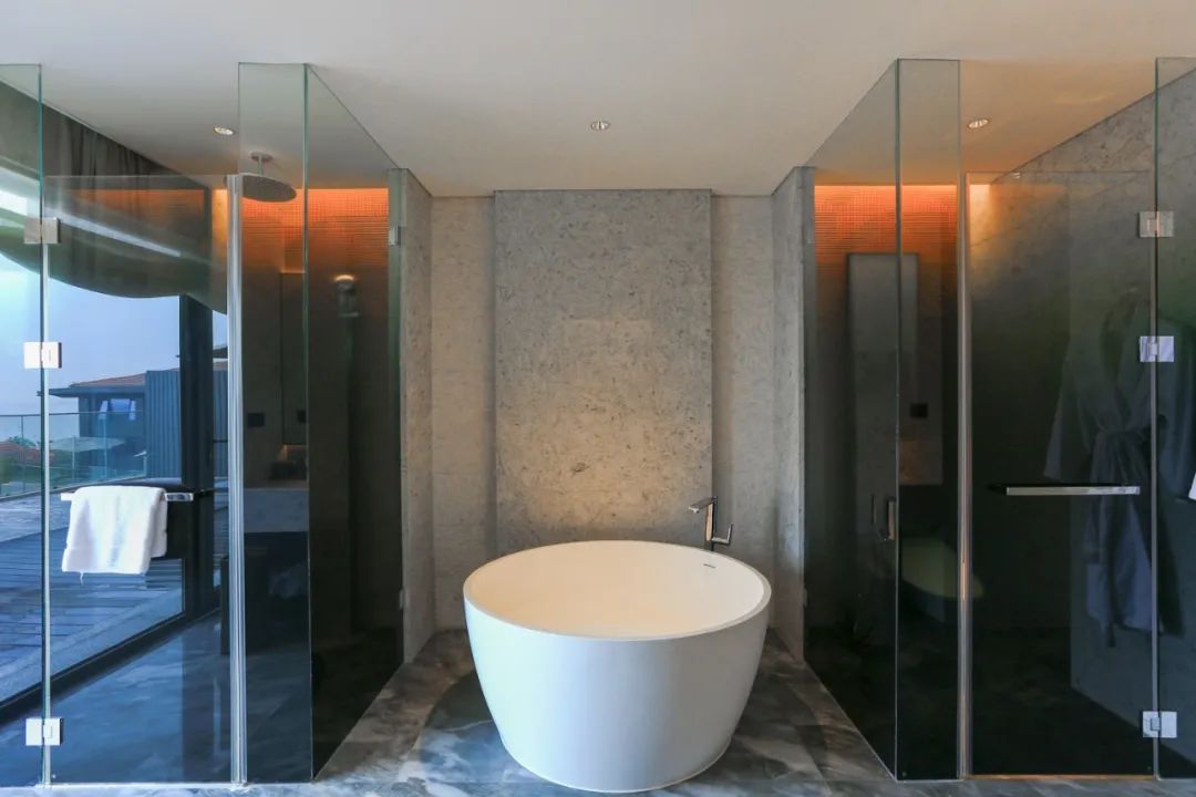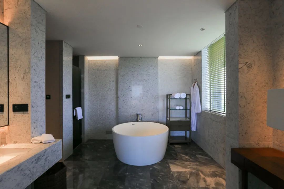 卫浴空间同样宽敞而舒适,超大的圆形深泡浴缸几乎成为度假生活中不可或缺的元素了。