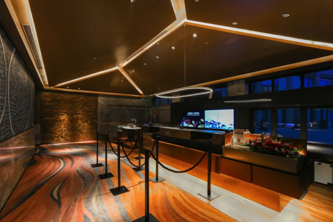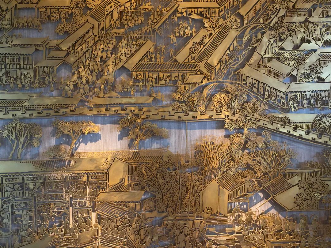 大堂左翼是酒店的前台,尽头有一幅非常显眼的铜版镂刻画《姑苏繁华图》,而前台对面的墙面上,令人熟悉不过的水乡古镇地面的石板路花纹,都在提醒着客人:这里是苏州。