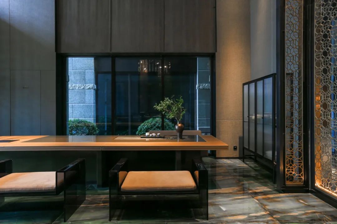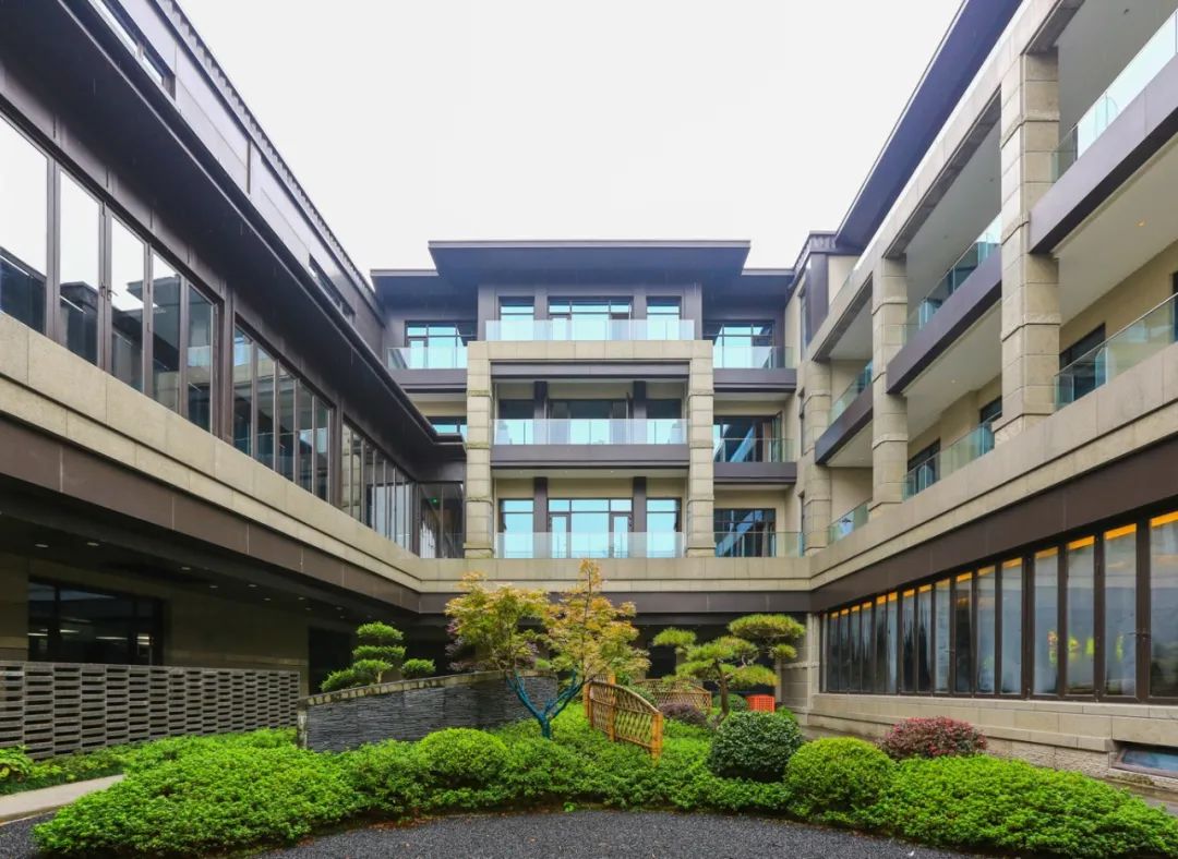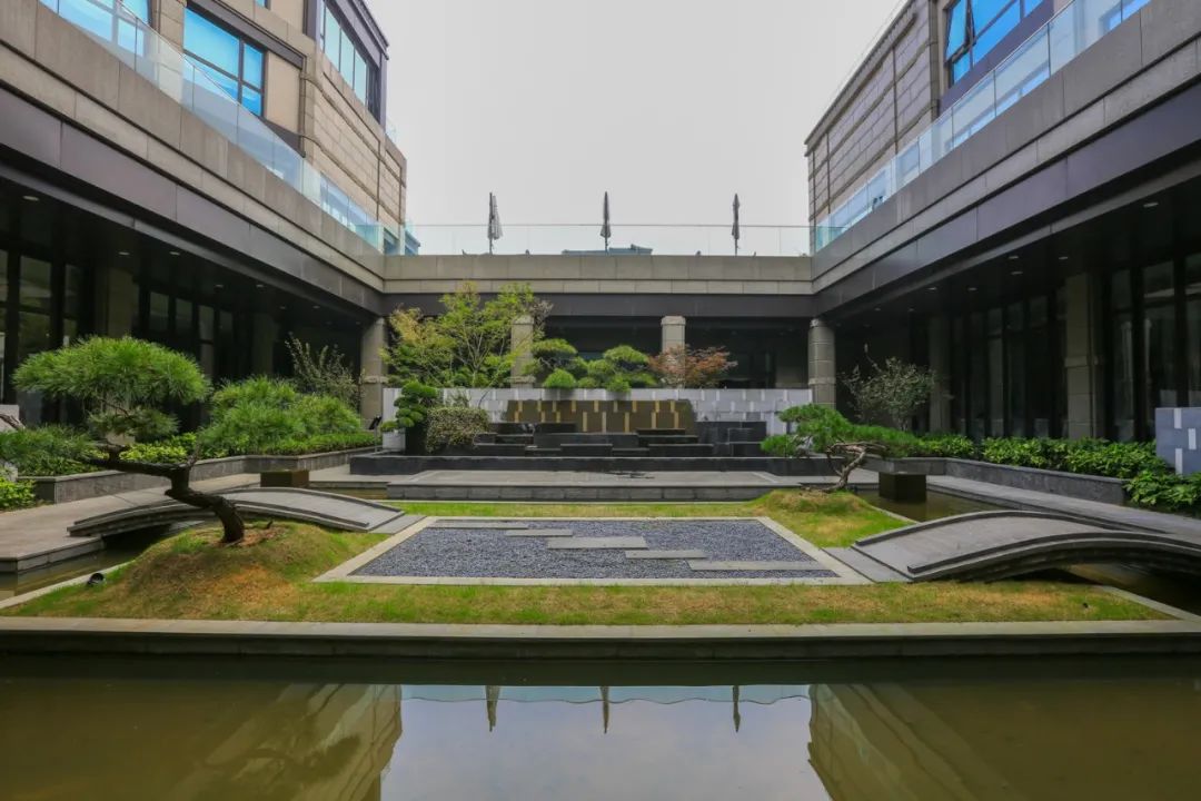 更有新意的设计是,刻意抬高了一层大堂的水平线,留出了以功能区为主的零层空间,而零层同样有着自然光照,还因地制宜地围合出三个独立的中庭院落,苍松翠柏、湖石漾潭,氛围感十足。