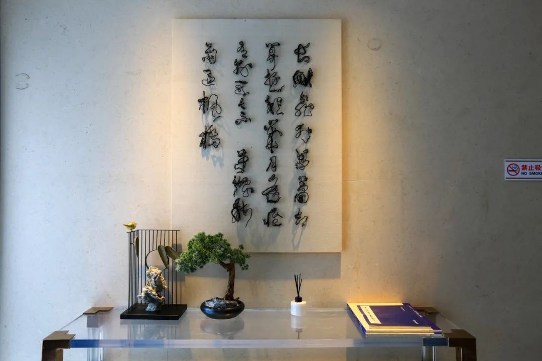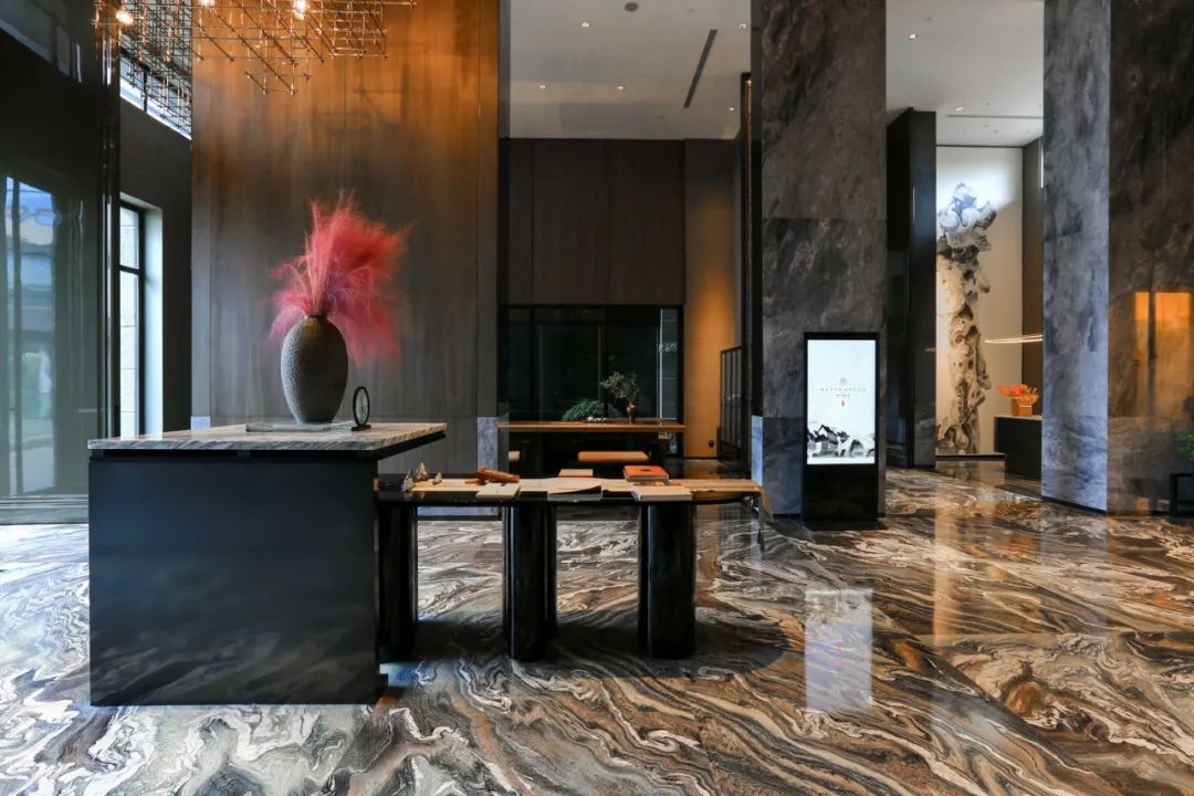 落地窗外是景观草坪,而大堂里惬意的休闲空间里装饰着粉黛草和活字雕版等文化装饰,表达着古典而文雅的美学态度。