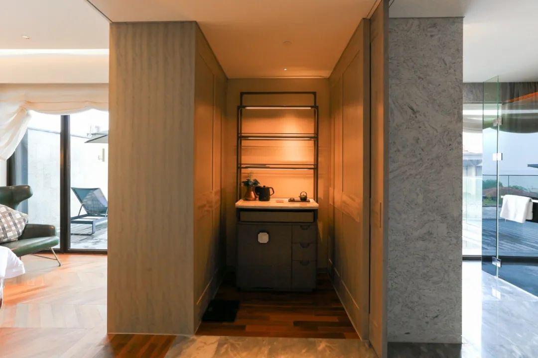 这个湖景房有一个中央的门厅,一侧卫浴,一侧卧室,露台也是非常的宽敞,已经很接近于一间精致套房的格局了。