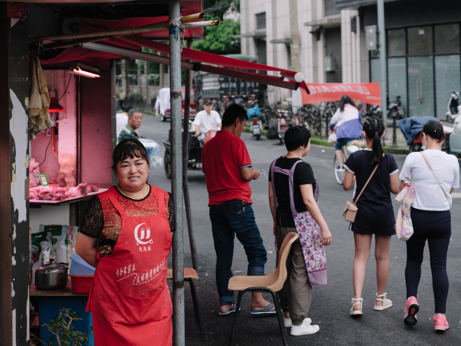 定海港路沿街窗内烧菜的阿姨,这条路原名周家嘴路,街道后边原本有一条河浜,几十年前被填平,已经找不到曾经存在的痕迹。