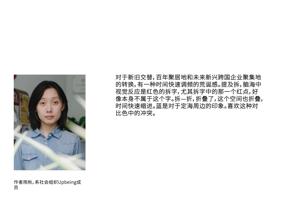 地块北侧边缘的海洲路,沿街老屋的门面已用水泥封死。拆迁意味着崭新生活方式的到来,也意味着邻里关系等旧有记忆的逝去。基于对“拆迁主题”的兴趣,位于上海杨浦区定海路街道的社会组织upbeing,发起名为“过渡”博物馆的社区项目。作为社区的外来者,upbeing负责人吴秋玲和她的同事搭建了线上平台“行动村”,引导居民发现自己的需求,并调度资源,将这些想法以不同形式的协作孵化。