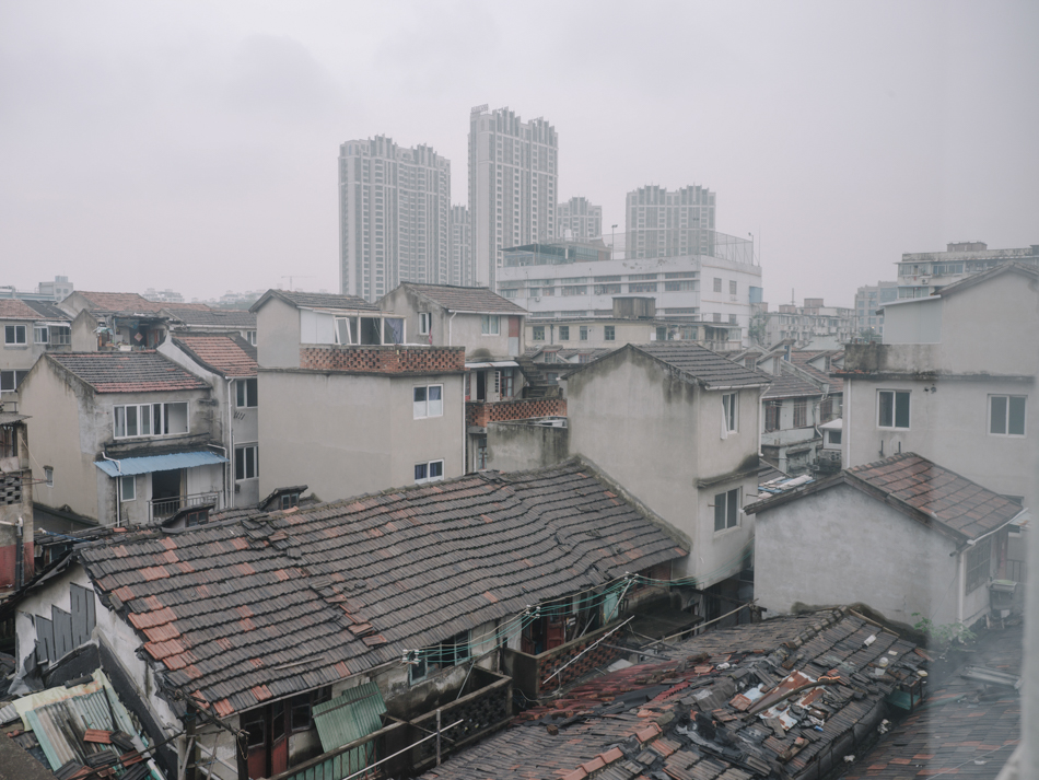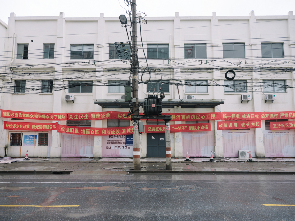 弄堂里的马桶。排队倒了几十年马桶,修修补补的破房陋巷,越来越挡不住湿气,也挡不住潇洒穿梭的老鼠。终于等到好消息的居民神清气爽,纷纷签约,到9月为止,只剩下30户左右还没搬走。不远处的隆昌公寓,拥挤如猪笼城寨,供人拍照留念。从旧日弄堂向杨浦滨江穿行,只见成片矮楼中凸起的现代建筑立面反射出银光闪闪发亮,穿着制服的服务员在玻璃幕墙后彬彬有礼,远处两根巨大的红白条纹烟囱,与弄堂白底红字密密麻麻的“拆”,只隔了一条施工中的马路,构成了奇特的互文。