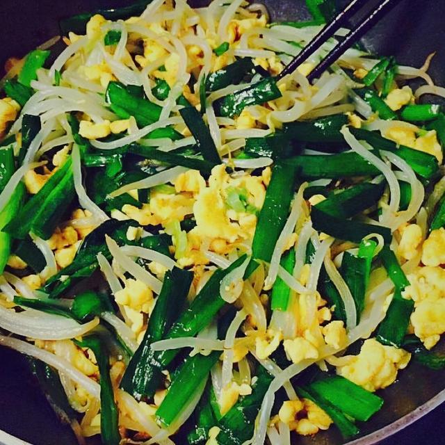 紧接着:我们再次倒油,加入豆芽韭菜,均匀翻炒,先让韭菜和豆芽在里面欢快的跳个舞,我们再适当的加入生抽和蚝油,均匀热炒一番,这时我们待用的鸡蛋可以隆重出场了,翻炒时间不用太长,翻炒2-4分钟就可以出锅了。如果觉得太清淡的朋友,可以放入一些青辣椒来增加自己的味蕾和视觉感。