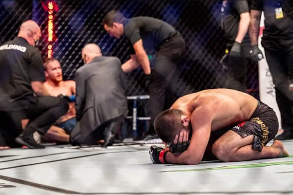 所以在第二回合裁判终止了比赛后,哈比布没有像以往般庆祝胜利,而是径直走向擂台中间双膝跪地,蒙面痛哭。这是哈比布职业生涯中极罕见地表露出巨大的情绪起伏,而清醒后的加瑟基也是第一时间走到对手身边对其表示敬意与安慰。当一场精彩的战斗转化为各种情绪的宣泄时,所有的观众无不为之动容。