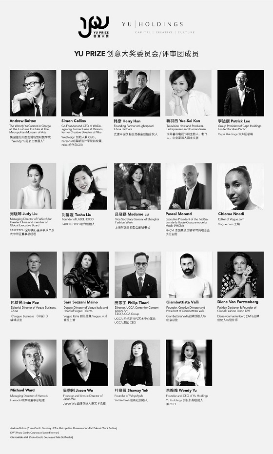 Yu Prize创意大奖的委员会及评审团由时装、艺术和文化领域内的杰出领袖所组成,融汇中西最权威行业人士,涵盖产业链各个环节,从投资者、时装工会、艺术机构,到设计师和集团高管、再到媒体和线上线下零售商。