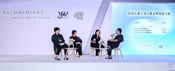 论坛四:疫情后独立设计师品牌的危与机——Huishan Zhang品牌创始人张卉山、Feng Chen Wang品牌创始人王逢陈、Comme Moi品牌创始人吕燕、资深媒体人梁家俊(由左至右)