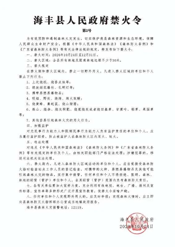 为有效预防和遏制森林火灾发生,切实保护海丰县森林资源和生态环境,保障人民群众生命财产安全,汕尾市海丰县近期发布了《海丰县人民政府禁火令 第2号》,明令禁止以下七种行为:上坟烧纸、烧香点烛等;燃放烟花爆竹、孔明灯等;携带易燃易爆物品;吸烟、野炊、烧烤、烤火取暖;烧黄蜂、熏蛇鼠、烧山狩猎;炼山、烧杂、烧灰积肥、烧荒烧炭或者烧田基草、甘蔗叶、稻草、果园草等;其他容易引起森林火灾的用火行为。禁火范围为全县林地及距林地边缘不少于30米范围内。