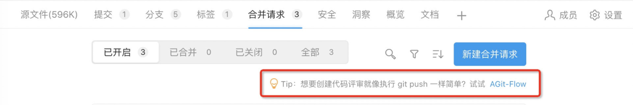 在云效Codeup 的"新建合并请求"按钮的下方,有一条低调的提示,如图: