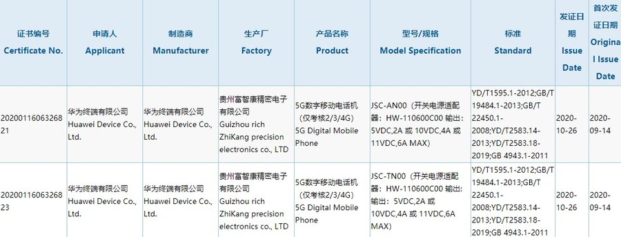 10月27日,华为旗下两款手机于近期入网,型号为 JSC-AN00 与 JSC-TN00,目前已通过3C认证,为5G手机。目前两款5G 手机申请人与制造商均为华为终端有限公司,生产厂为贵州富智康精密电子有限公司,发证日期为 10 月 26 日。