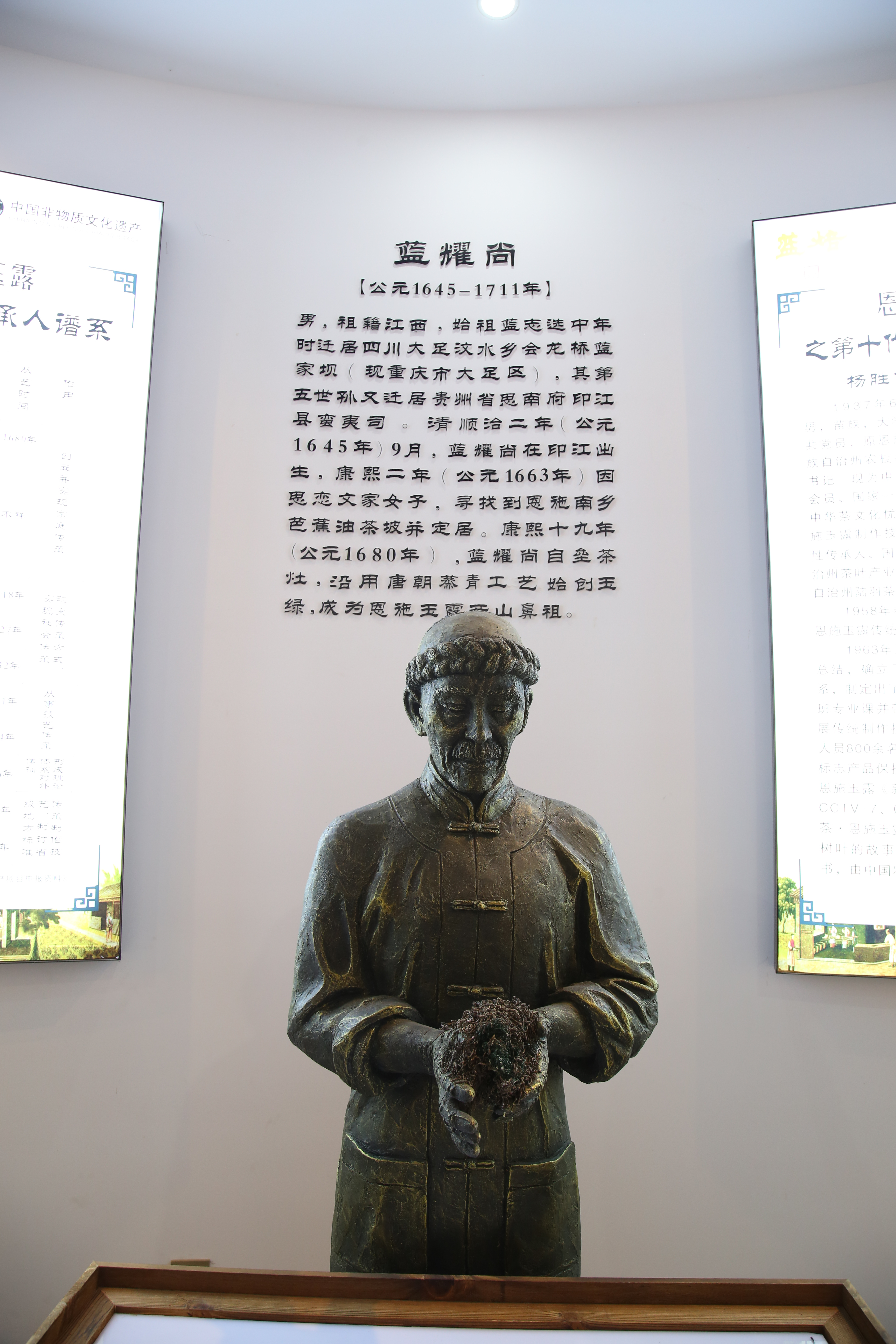 从湖北省恩施州城出发,驱车向东北方向行驶20多公里,就到了恩施市白杨坪镇洞下槽村。初秋时节,这里山色朦胧,湖水荡漾。我们的第一站来到了亲硒源茶厂,这里有绿色食品认证茶园面积1000余亩,已建成恩施玉露、富硒茶、抹茶、红茶4条现代化生产线,建立了集恩施玉露现场制作、品饮、销售为一体的恩施玉露传统技艺展示馆体验馆,亲硒源茶叶公司已经在洞下槽村耕耘多年,生产的蓝焙恩施玉露茶也小有名气,洞下槽村农户的茶园成为蓝焙恩施玉露茶的鲜茶基地。茶园不仅直接带动了村民收入的增加,而且连片成规模的茶园已经成为亮丽的风景,
