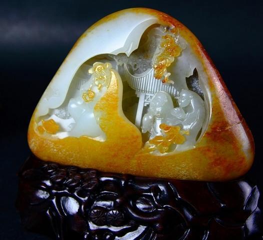 5、黄玉:基质为白玉,因长期受地表水中氧化铁渗滤在缝隙中形成黄色调。根据色度变化定名为:密蜡黄、栗色黄、秋葵黄、黄花黄、鸡蛋黄等。色度浓重的密蜡黄、栗色黄极罕见,其经济价值可抵羊脂白玉。在清代,由于黄玉为"皇"谐音,又极稀少,一度经济价值超过羊脂白玉。