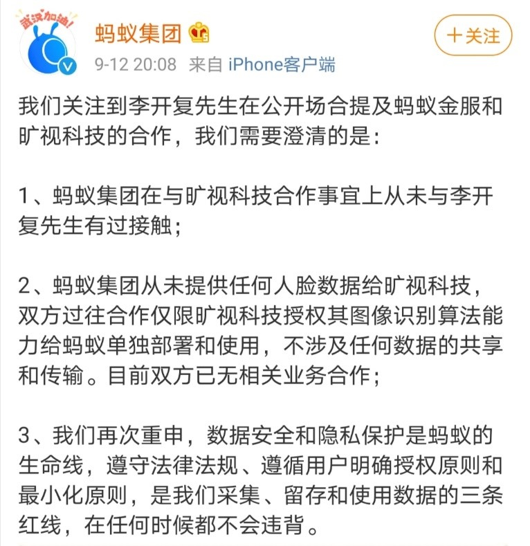 当晚,蚂蚁集团官方表示,从未提供任何人脸数据给旷视科技;旷视科技也表示,不掌握也不会主动收集终端用户的任何个人信息。