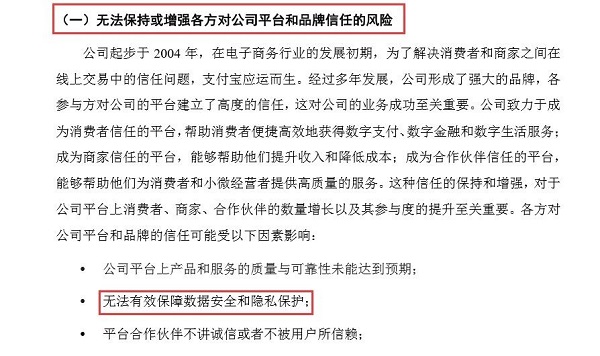 大致可以理解为,在招股书中哪个风险因素顺序越靠前,哪个风险因素就越重要。在蚂蚁集团招股书中,共罗列了26项与业务发展相关的风险,其中第1项是:无法保持或增强各方对公司平台和品牌信任的风险。