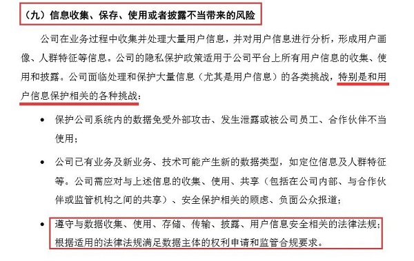 除此之外,26项中的第9项风险为:信息收集、保存、使用或者披露不当带来的风险。该风险指出,蚂蚁集团面临处理和保护大量信息(尤其是用户信息)的各类挑战,特别是和用户信息保护相关的各种挑战。