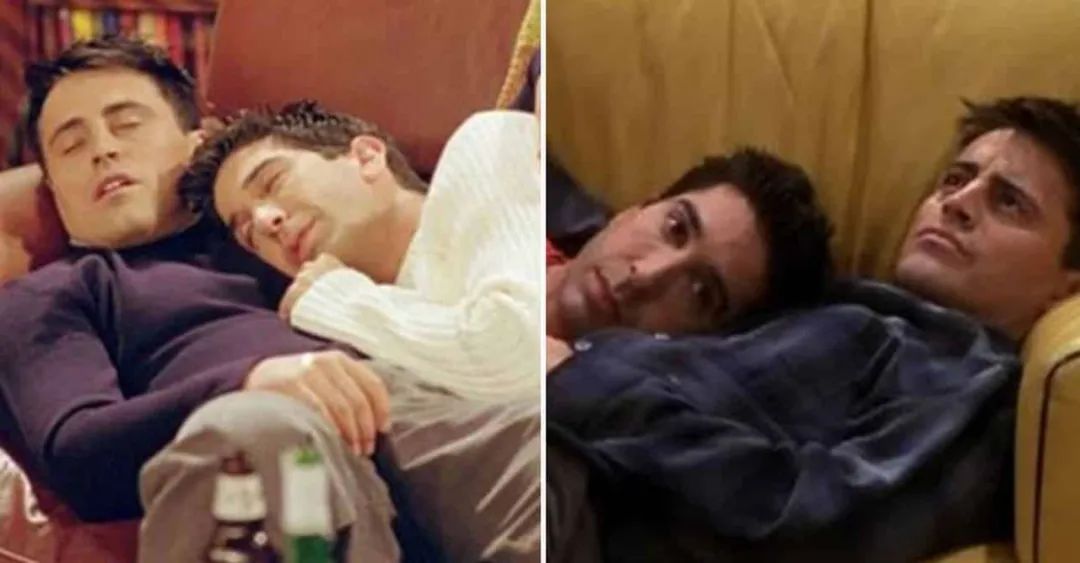 比如,Ross和Joey有一次在沙发上一起睡着了。醒过来彼此觉得不对。但此后,Joey觉得感觉不错,于是来跟Ross折腾。