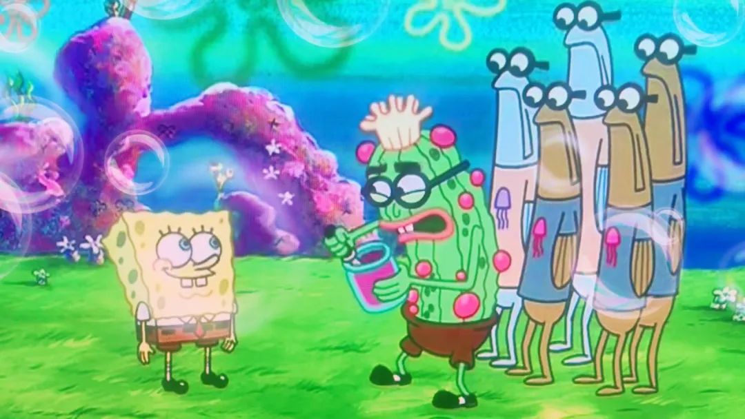 像这样带有双关意义的剧情还有不少。比如海绵可以进行无性生殖——出芽生殖。而在 Pressure 这一集里,海绵宝宝就利用出芽生殖证明自己比陆地上的生物牛皮。