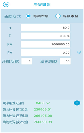 “金拐棍-房贷计算器”不仅能够计算每月还款金额,还能计算某段时间内偿还的本金,偿还的利息和未偿还的贷款金额,这也是金拐棍-房贷计算器相对于其他房贷计算器的优势。