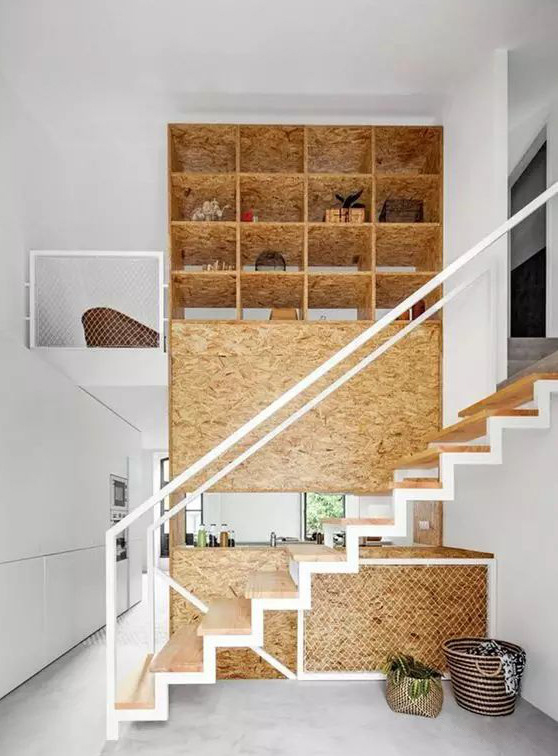 欧松板既可以像本期案例中那样作为内层使用减少甲醛排放又可以直接用在表面使用。欧松板的纹理和颜色比较单一,但在设计师的眼里有一种独特的美感。也因为这样越来越被广泛运用在一些Loft办公室和家装案例中,设计师们巧妙运用欧松板来为空间提升质感。在室内设计中,欧松板的肌理丰富、色彩柔和,在空间中比较百搭,还能衬托出空间内的光线,一起来欣赏下图这些加入欧松板的空间设计。