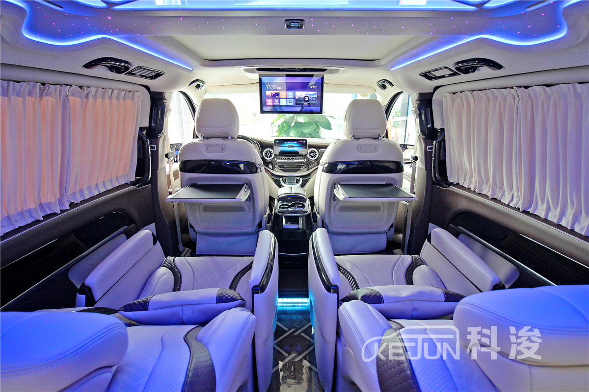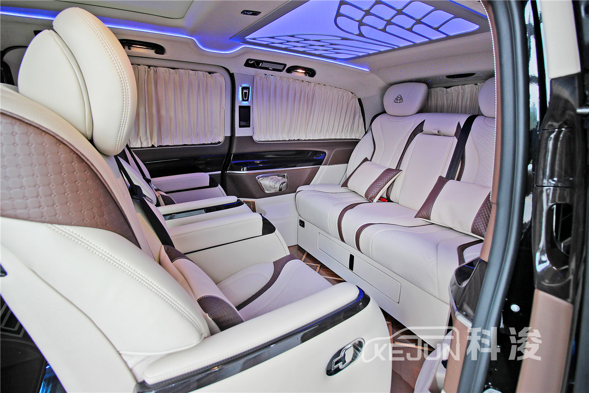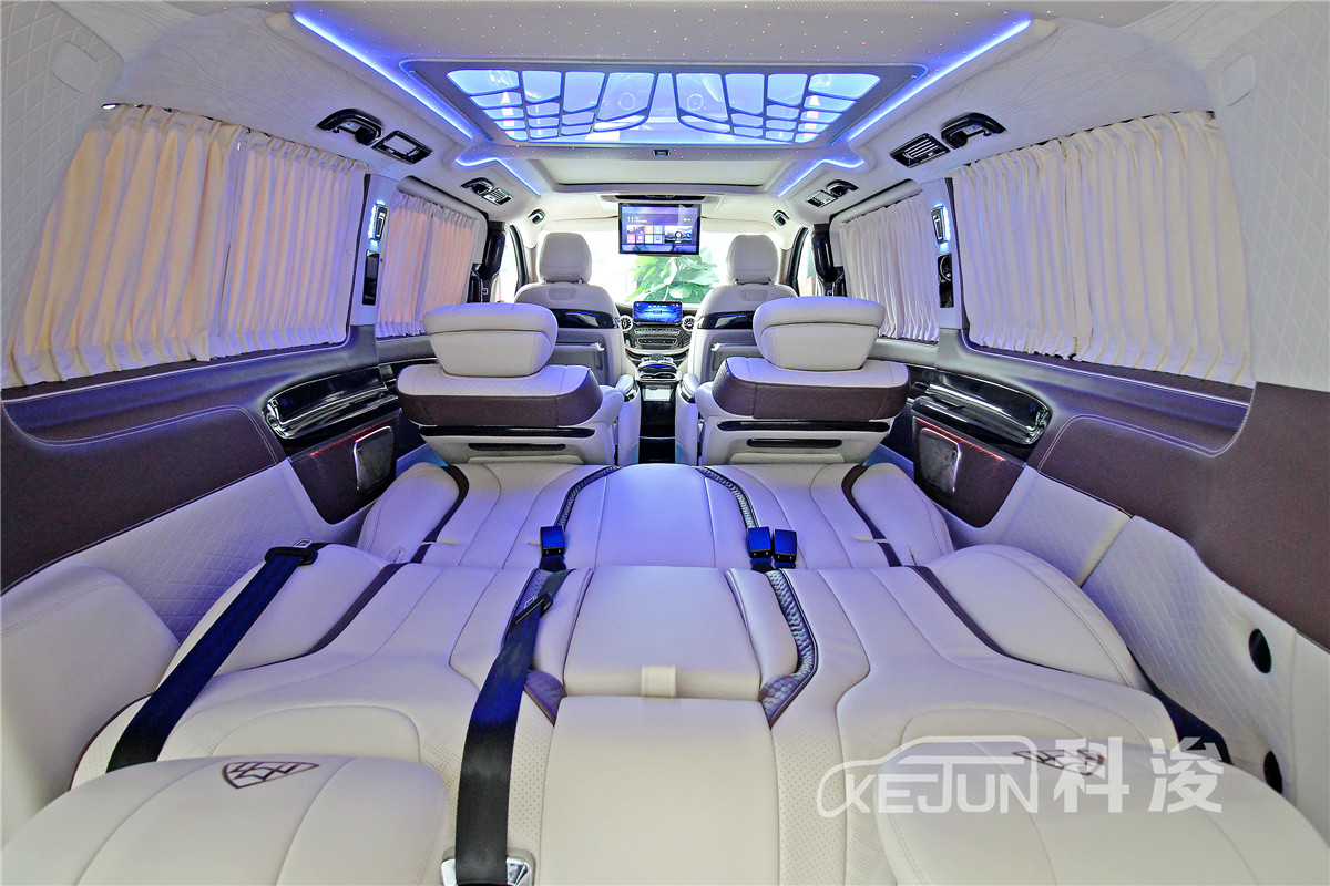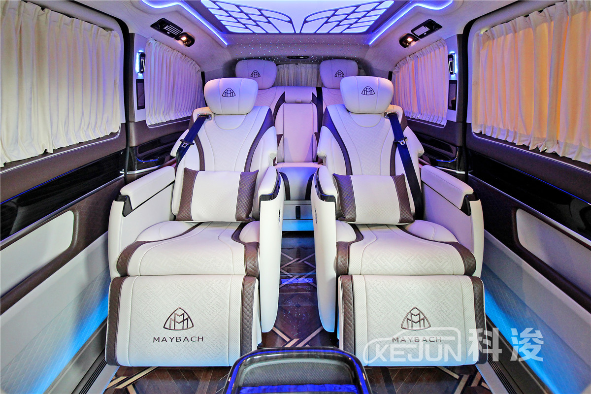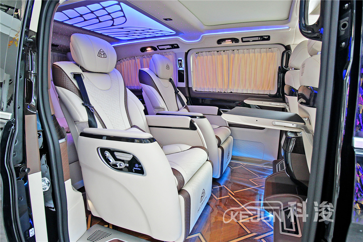 双侧带防夹电动中门,全车米色内饰设计,Nappa皮式迈巴赫级乘客舱中排航空座椅;180度旋转,带电动脚托,通风,加热,按摩;可调整到乘客舒适的角度,提高长途乘坐的舒适性。主副驾驶靠背配置折叠商务桌板,可以做为移动办公用途。15.6寸电动折叠智能多媒体娱乐系统,智能后排集成触控屏可控制整车后部氛围灯及电器设备;乘客舱进口雕花木地板设计,中门冷光氛围灯设计,高级进口私密鹅绒窗帘,乘客舱电动天窗带遮阳帘,提高车主私密性。