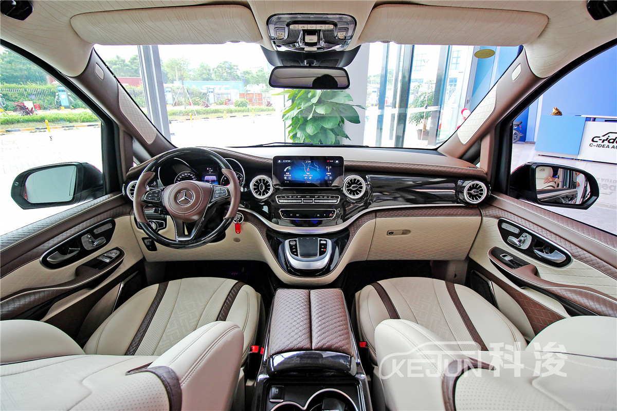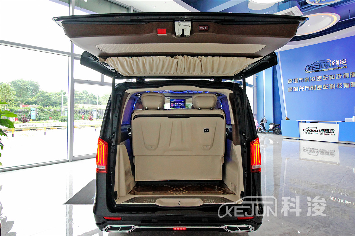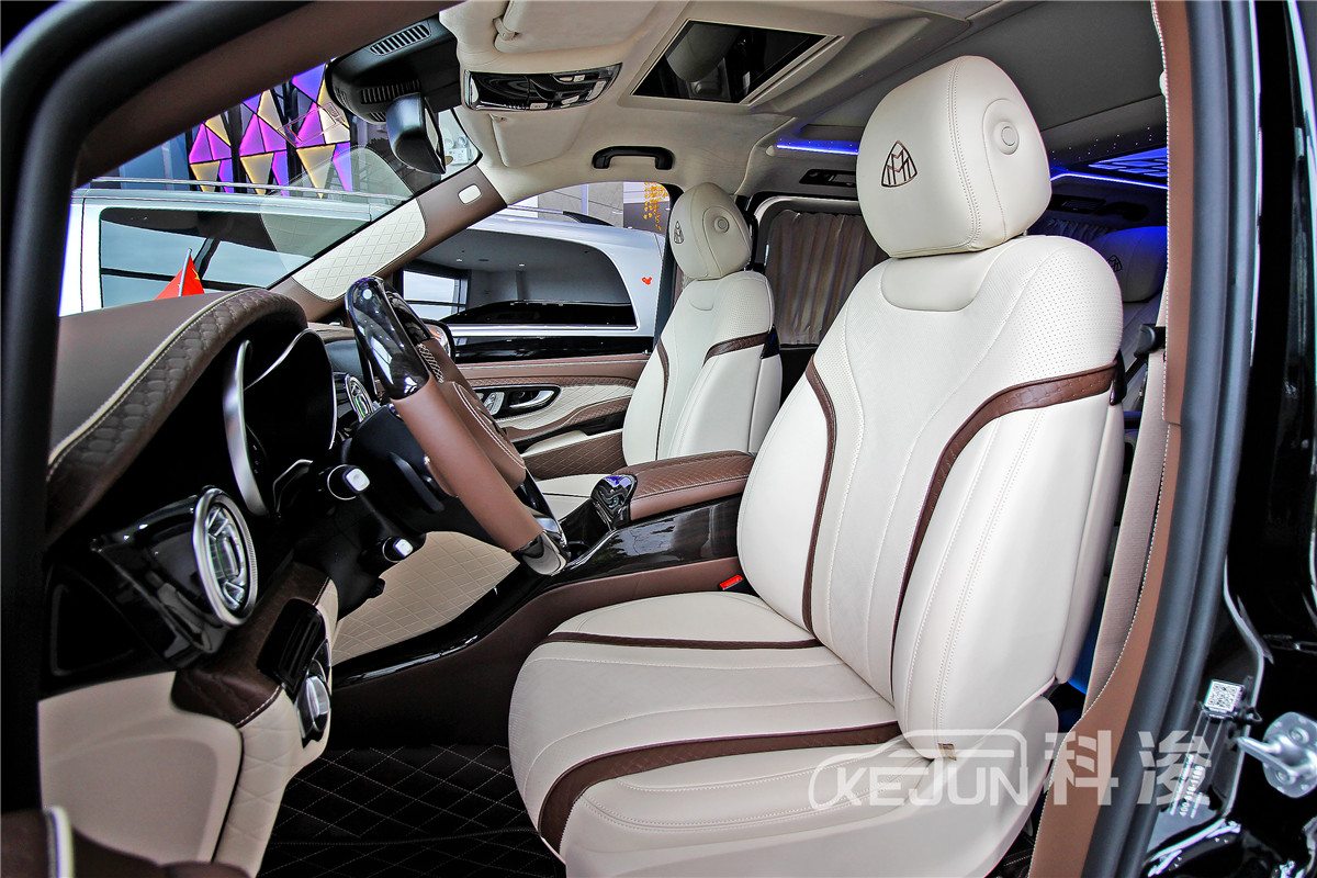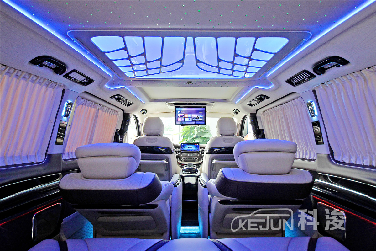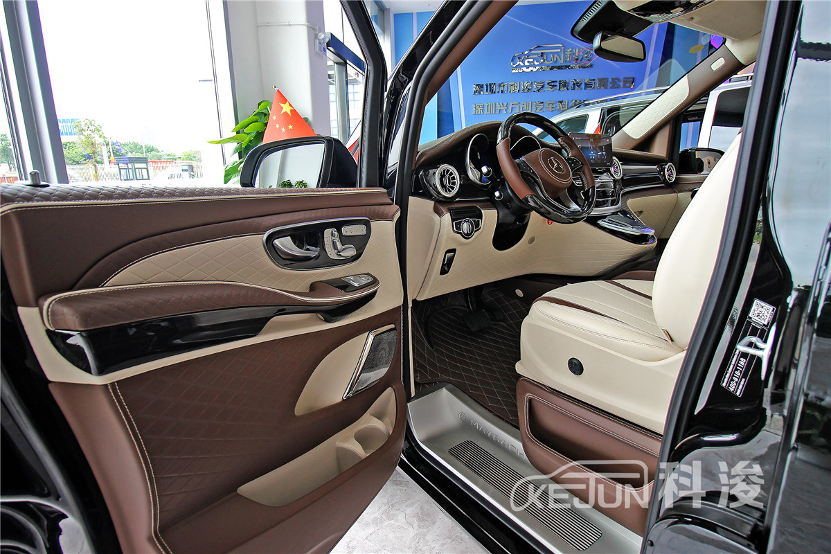 双侧带防夹电动中门,全车米色内饰设计,Nappa皮式迈巴赫级乘客舱中排航空座椅;180度旋转,带电动脚托,通风,加热,按摩;可调整到乘客舒适的角度,提高长途乘坐的舒适性。主副驾驶靠背配置折叠商务桌板,可以做为移动办公用途。15.6寸电动折叠智能多媒体娱乐系统,智能后排集成触控屏可控制整车后部氛围灯及电器设备;乘客舱进口雕花木地板设计,中门冷光氛围灯设计,高级进口私密鹅绒窗帘,乘客舱电动天窗带遮阳帘,提高车主私密性。