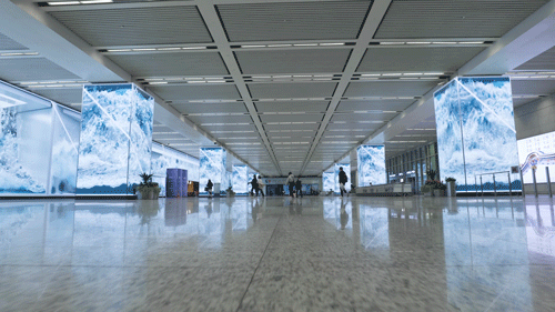 走出机场航站楼,在枢纽中心迎面而来的U型屏和两侧的大屏,让旅客无论是从哪个角度都能感受到扑面而来的海浪。