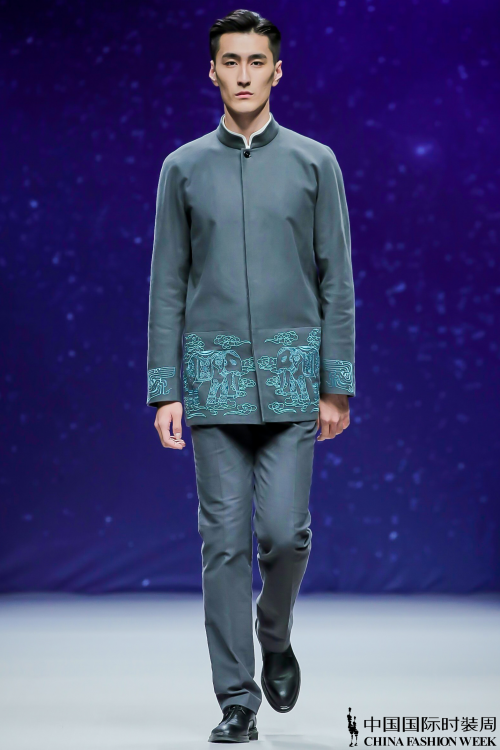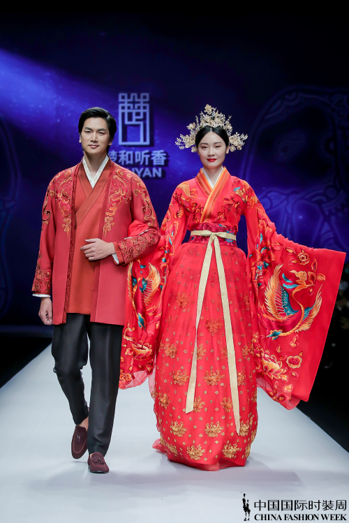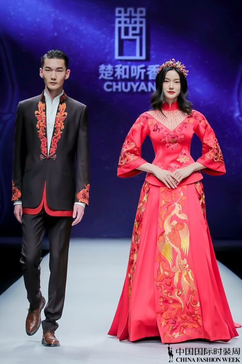 整个发布会作品分为「新中式·风度」、「新中式·正装」和「新中式·吉服」三个部分。