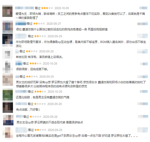 然而也有部分网友表示“男女主没cp感,罗云熙真的不适合现代装”、“霸道总裁和职场小白的故事真的拍烂了”、“作为职场剧情节悬浮,作为偶像剧cp互动生硬”。