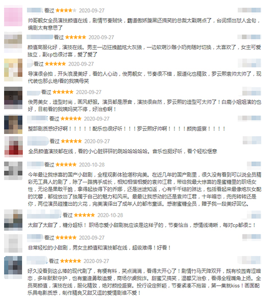 其中大部分网友表示“帅哥靓女全员演技颜值在线,剧情节奏贼快,霸道傲娇腹黑还搞笑的总裁太戳萌点了,台词频出怼人金句”、“既有校园青涩暗恋,多年默默守护,也有重逢勇敢追爱,商场尔虞我诈。甜蜜又搞笑,温馨又治愈,看得全程嘴角上扬”、“非常轻松的小甜剧,男女主颜值和演技都在线,超级难得”。