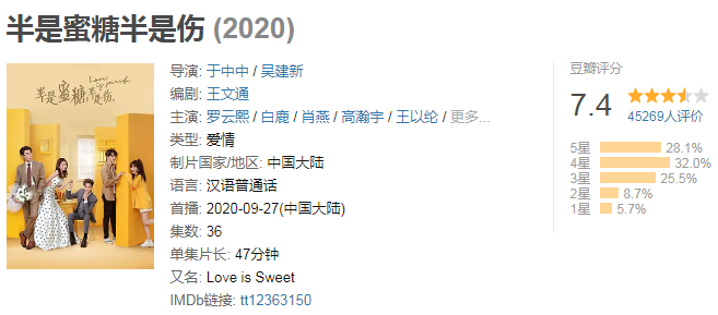 目前,《半是蜜糖半是伤》已完美收官,该剧在热度和口碑方面都取得了不错的成绩,豆瓣评分7.4分,网友们对该剧的评价也是十分精彩。