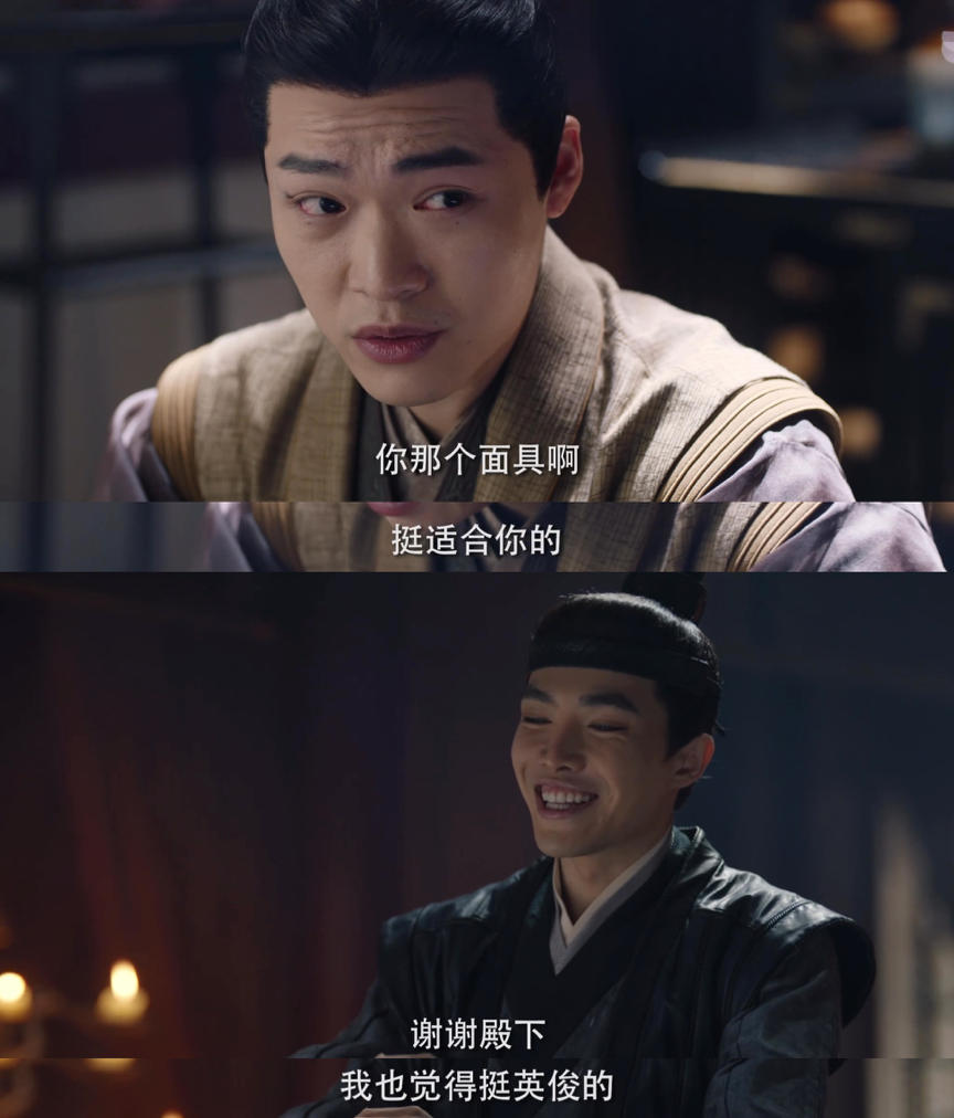另一边,让人恨得牙痒痒的成王,偶尔也会展露可爱的一面,比如下面这段对下属戴面具的夸赞,画面莫名喜感。