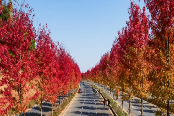 连绵6.68公里的枫树让整条大道色彩斑斓,车辆畅行其间宛若童话世界。公路三条绿化带总共种植了2918棵红枫,在阳光的照射下,层层叠叠的枫叶呈现出绚丽夺目的色彩。