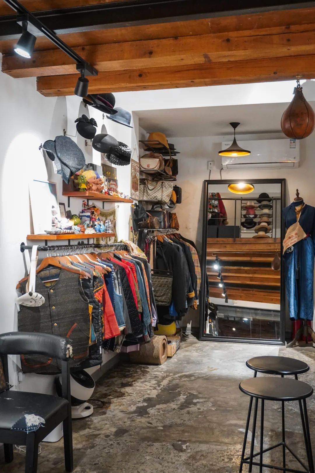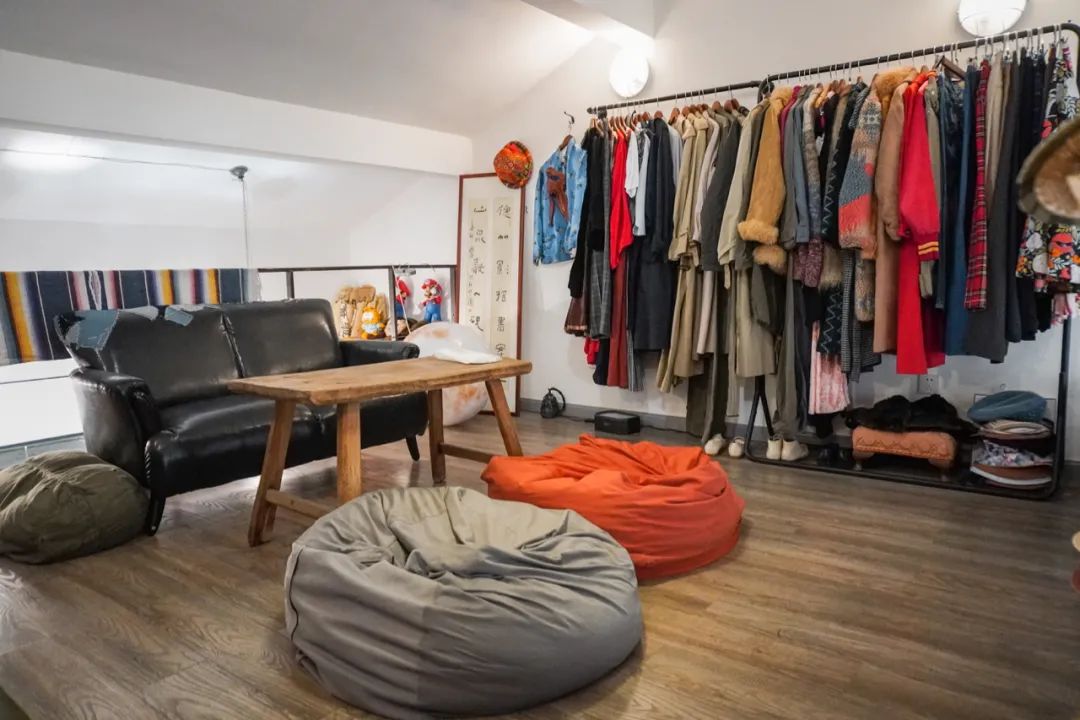 这是一家从墙体地砖到座椅摆设每个细节都走复古路线的一家集合店,店内的陈列元素丰富但不杂乱,店内的古着大都是主理人从日本淘回来的,上下两层都有,可以逛很久。
