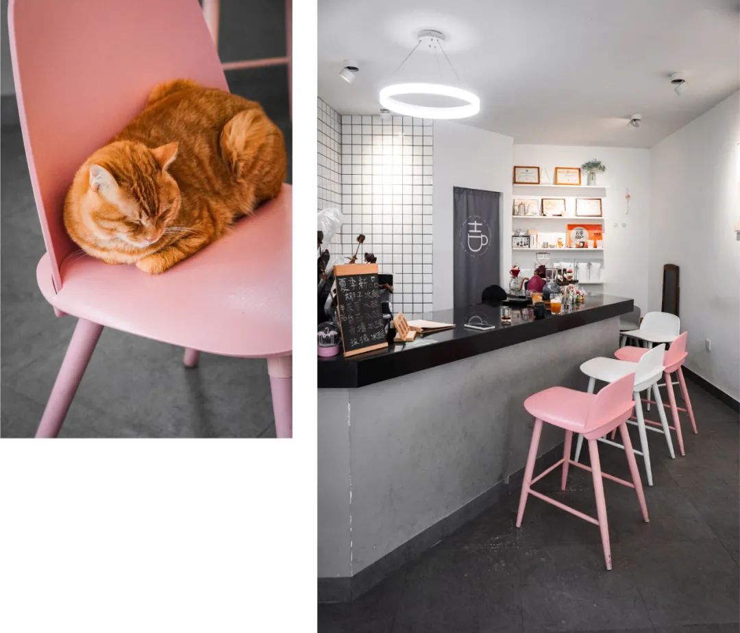 店内布局简单,空间内除了客座外,随意摆放着一些书籍和装饰,两只小猫懒洋洋地趴在椅子上午睡,靠窗的位置有客人在安静办公,音乐轻柔舒缓,虽然装修谈不上好看,但整体感受非常舒适。