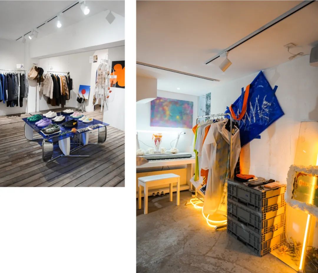 店内一层分为了快闪展览区和咖啡区,二层则是一个小众潮牌的买手店以及露台,功能区域划分分明,选品的价格在百至千元,大众接受度高。
