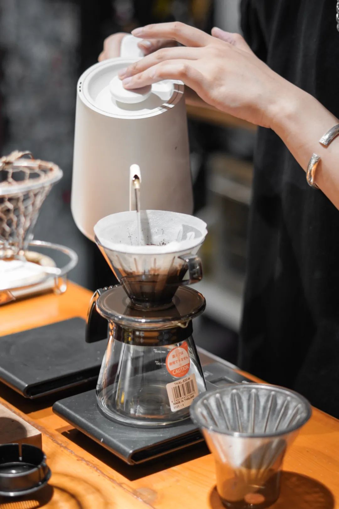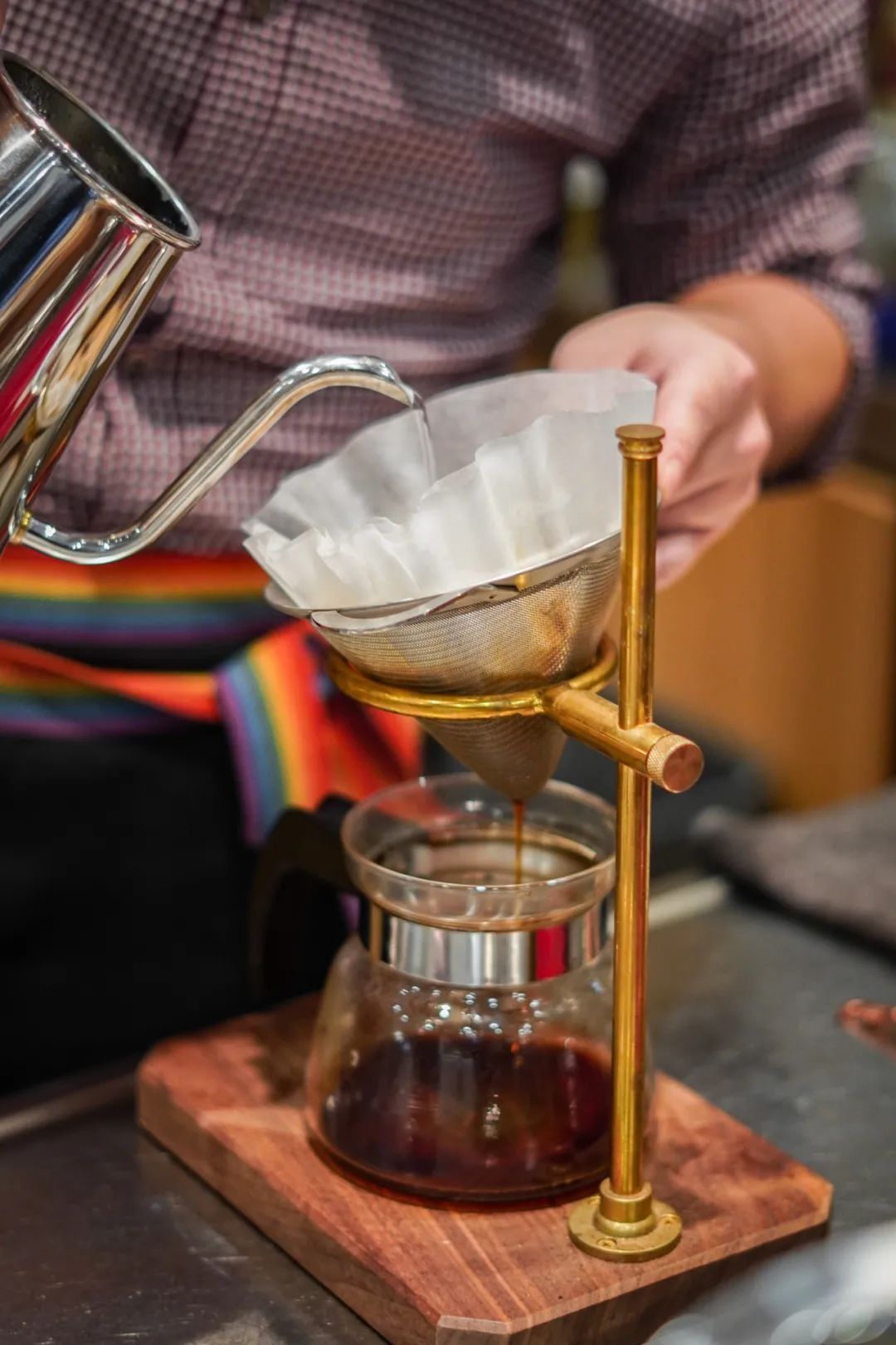 店内制作手冲咖啡用的是金属滤网,相比于滤杯,它的透气性和流动性更高,更容易萃取出非常均衡的复合风味。