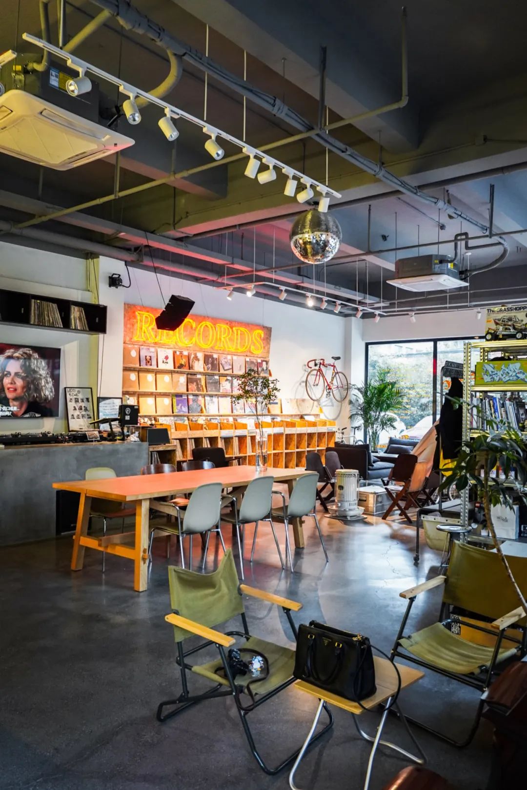 一整面LP唱片、野营帐篷、复古单车......店内播放着的Funk Rock音乐,让人忍不住就要闭着眼做梦回到上个世纪六十年代,开破皮卡公路旅行做嬉皮士了,氛围感十足。