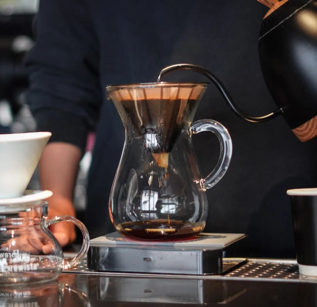 当然店内也不全是深烘豆,极浅烘的蓝标瑰夏在干香就展现出了非常浓郁的花香味,注水时咖啡师通过不断晃动滤网增加萃取率,香气层层递增。