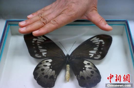 10月30日,山西省太原市昆虫陈列展示馆,59岁的昆虫收藏家曹天文展示他收藏的世界最大蝴蝶标本“鸟翼凤蝶”。曹天文是山西省农科院植保所研究员,也是世界节肢动物专家,他历经35年收藏蝴蝶标本10万余只,并全部用于昆虫陈列展示馆收藏。目前,该馆保存有蝴蝶标本2000余种,其中世界著名珍贵蝴蝶标本500余种。