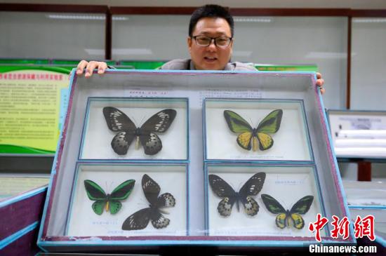 10月30日,山西省太原市昆虫陈列展示馆,59岁的昆虫收藏家曹天文展示他收藏的蝴蝶标本。曹天文是山西省农科院植保所研究员,也是世界节肢动物专家,他历经35年收藏蝴蝶标本10万余只,并全部用于昆虫陈列展示馆收藏。 (中新社记者 韦亮 摄)