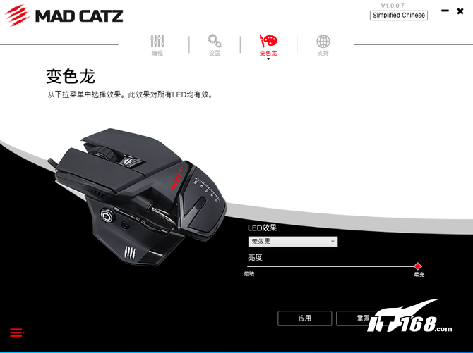 第三项叫变色龙设置,简单说也就是RGB跑马灯设置,可RAT 4+只有单色红光,只能在变色龙选项切换闪烁、长亮、呼吸等LED效果。