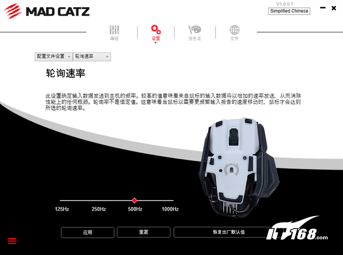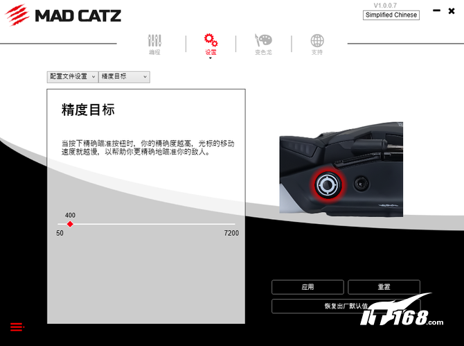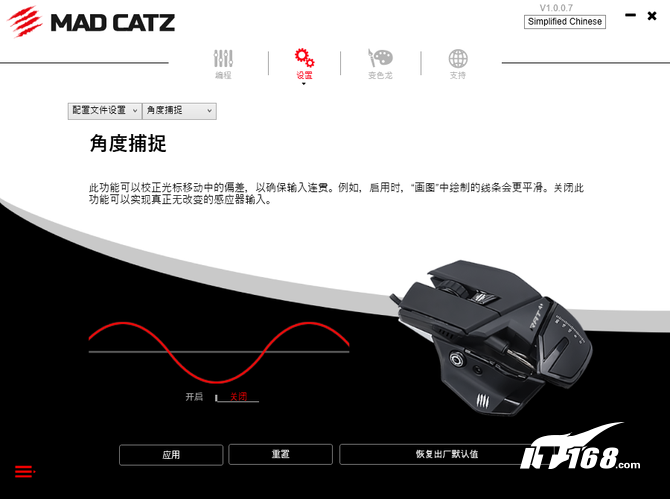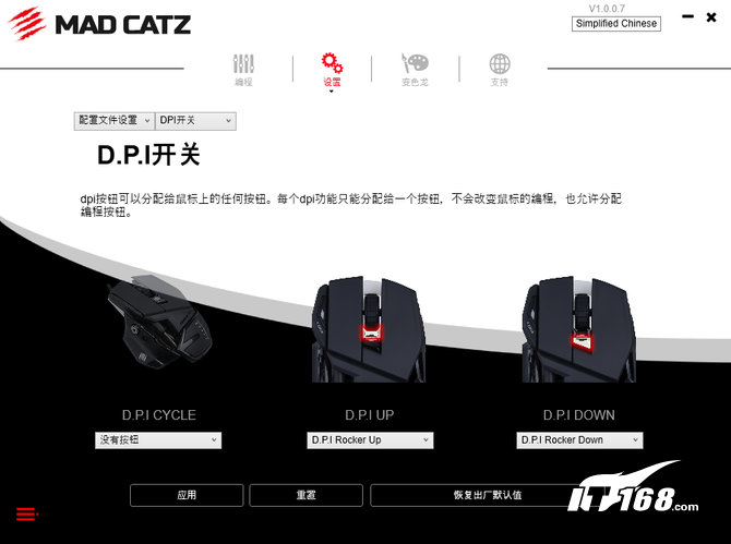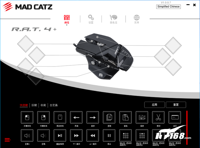Mad Catz驱动主页面为编程界面,7个可编程按键有20个键可选,只要把需要编程的按键拖入对应的按键空位即可。