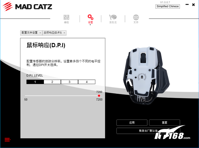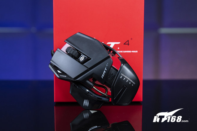 RAT 4+鼠标采用PMW3330光学引擎,一共有9个按键,其中7个可编程,左右键采用欧姆龙微动,可以点击超过2000万次,寿命超长,左键旁的MODE键可以切换4种预设的DPI值,最高7200DPI。