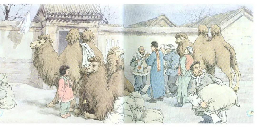 冬天快过完了,春天就要来了,太阳特别暖和,暖得让人想把棉袄脱下来。可不是吗?骆驼也脱掉它的旧驼绒袍子啦!它的毛皮一大块一大块地从身上掉下来,垂在肚皮底下。我真想拿把剪刀替它们剪一剪,因为太不整齐了。拉骆驼的人也一样,他们身上那件反穿大羊皮,也都脱下来了,搭在骆驼背的小峰上。麻袋空了,铃铛在轻松的步伐里响得更清脆。