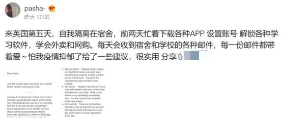 10月29日,知名主持人尼格买提的妻子帕夏古丽·都鲁坤在某社交平台上发文,记录自己去到国外的种种经历。在文中,她称自己自我隔离在宿舍,在前两天还解锁了各种学习软件,而且每天都能收到宿舍和学校的各种邮件,并称这些邮件都带着爱。