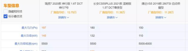 在引擎方面,三台车单就参数就已经形成了三个台阶,197马力、180马力以及150马力,最高的瑞虎7神行版197马力比最低的捷达VS5 150马力多出来了整整47匹,差距不可谓不大,就是对比同为国产车型的CS55 PLUS蓝鲸版,也多出来17匹马力。